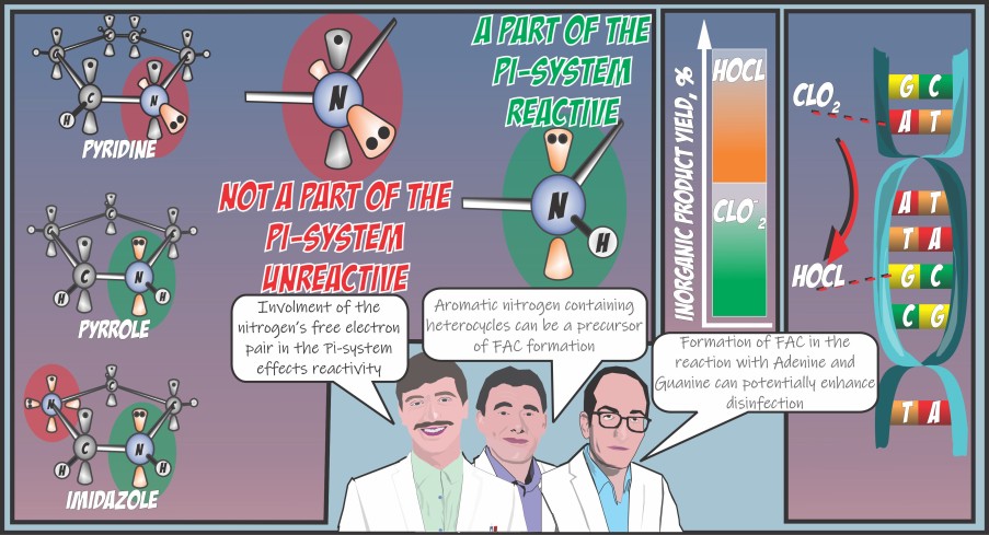 Chlorine dioxide (ClO2) is used for disinfection and preoxidation in water treatment, often as an alternative to free available chlorine (FAC) to reduce the formation of halogenated byproducts. However, the latest research has shown that FAC can be formed as a secondary oxidant in the ClO2 reaction with activated aromatic compounds, such as phenols. In this study, the reaction of ClO2 with aromatic nitrogen-containing heterocycles (NCHs) is investigated as another possible FAC precursor. Six-membered aromatic NCHs showed low reactivity (rate constants <10–3 M–1 s–1) while five-membered rings, namely pyrrole and imidazole, were more reactive. Pyrrole reacted with a rate constant of (1.18 ± 0.3) × 103 M–1 s–1 and formed 7 to 45% FAC depending on the ClO2 to pyrrole ratios. The imidazole reaction was pH-dependent since its anionic species (pKa = 14.4) rate constant was (2.08 ± 1.4) × 106 M–1 s–1. However, the reaction at pH 7 is relatively slow (6.7 × 10–2 M–1 s–1). Imidazole also showed 37% FAC formation. Nucleobases, adenine, guanine, as well as the pharmaceutical dexmedetomidine, have imidazole moieties and show a very similar reaction rate constant, FAC yield, and ClO2 consumption in their reaction with ClO2, pointing out the relevance of aromatic nitrogen-containing heterocycles in ClO2 application.