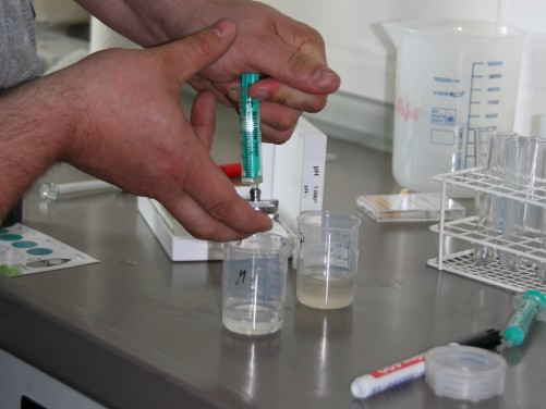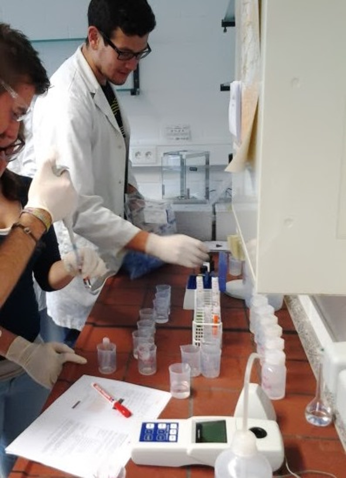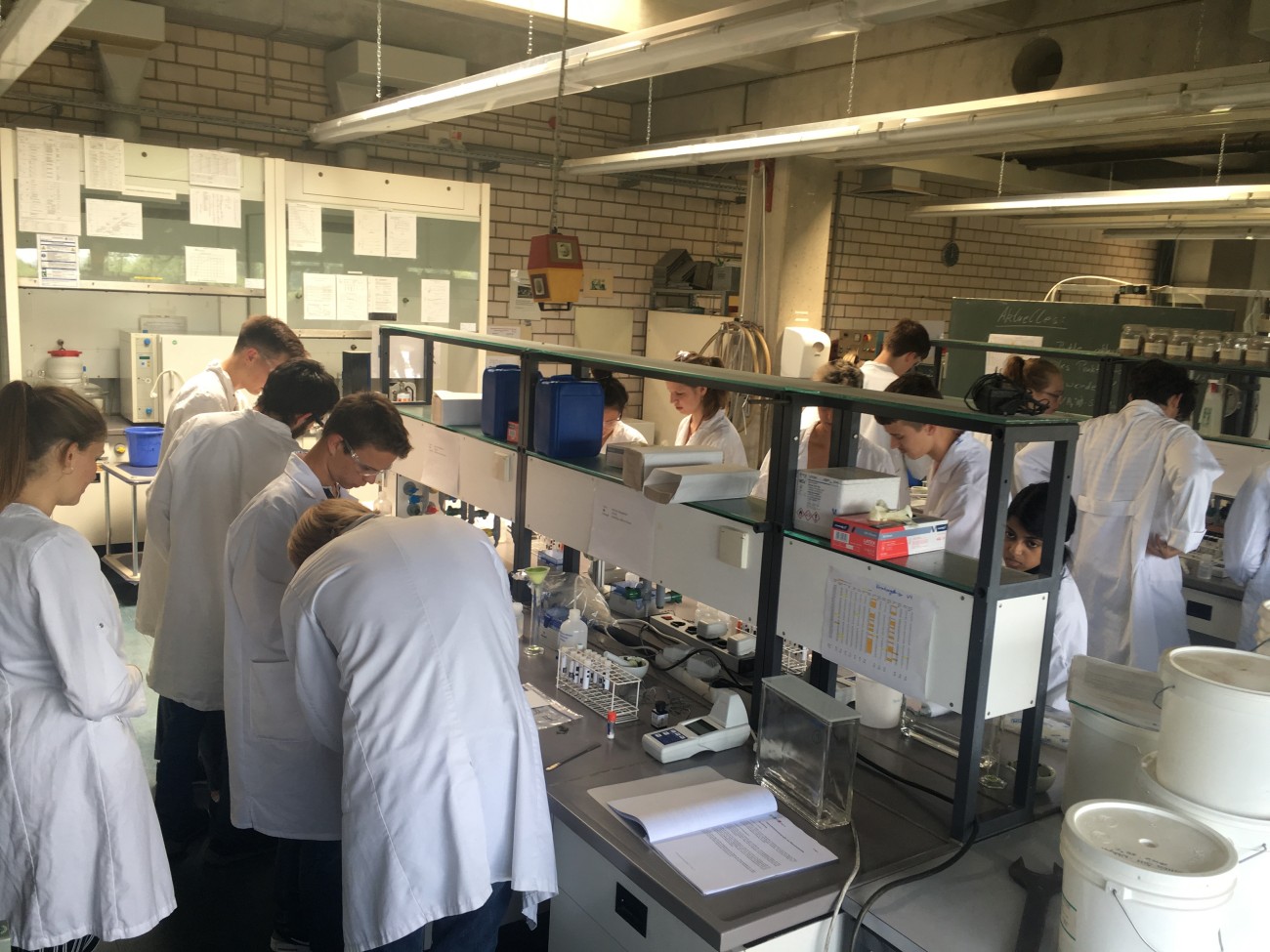 Students of the second and fourth semesters can carry out practical laboratory experiments under professional supervision in addition to their theoretical courses. The students examine water, soil and compost samples with the aid of rapid analytical methods (colorimetry, photometry, titrimetry) as well as simple instrumental laboratory methods and learn the professional evaluation of the results.
