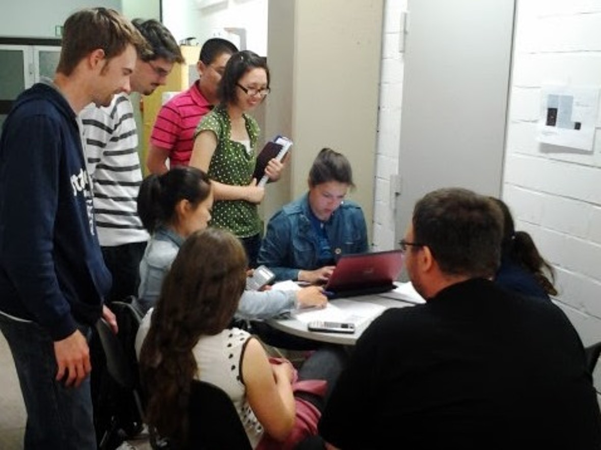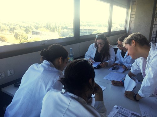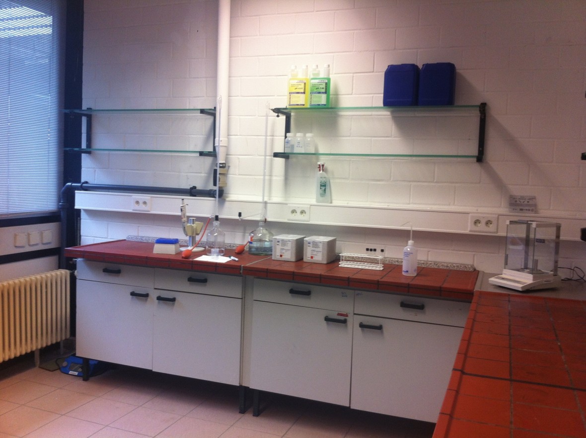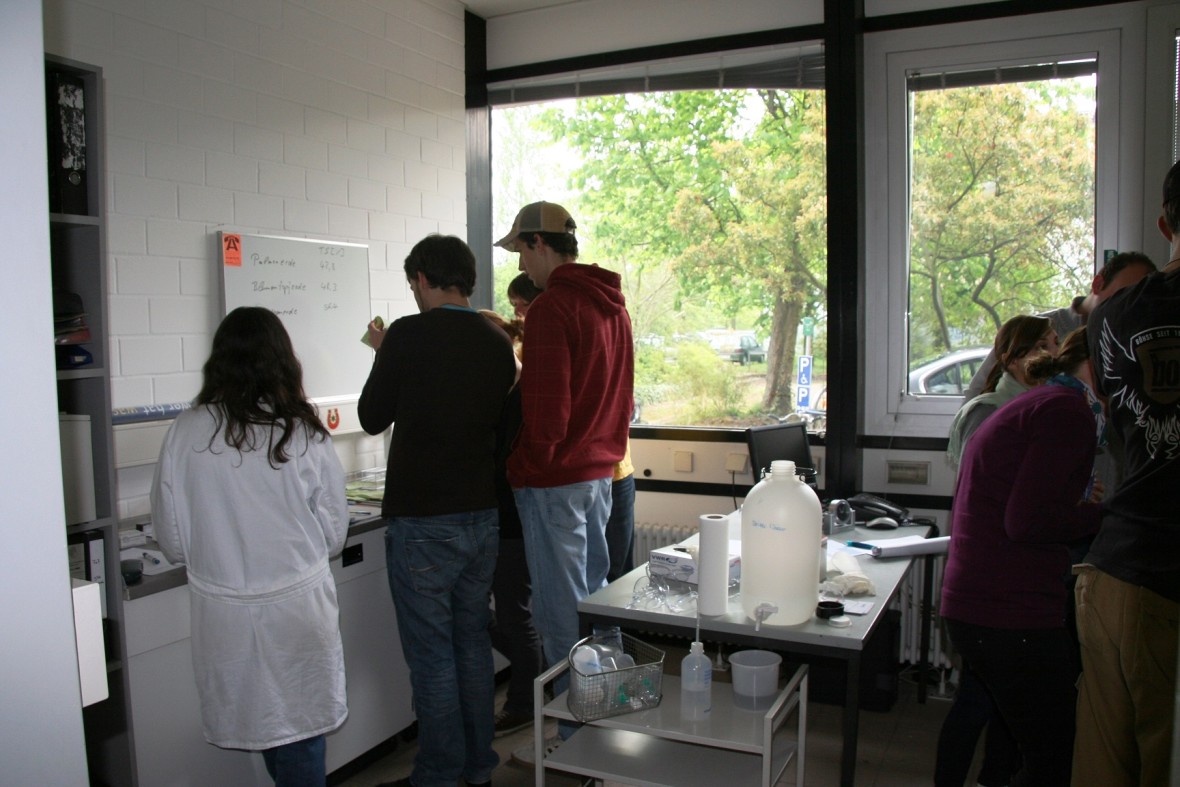 Directly in front of the teaching laboratory, workstations were set up for joint evaluation. A newly installed WLAN hotspot made it possible to carry out online test and use the accompanying moodle online courses on site. In the summer semester of 2013, the teaching laboratory was able to move to a new, much larger room which enables up to eight students and two tutors to work at the same time.